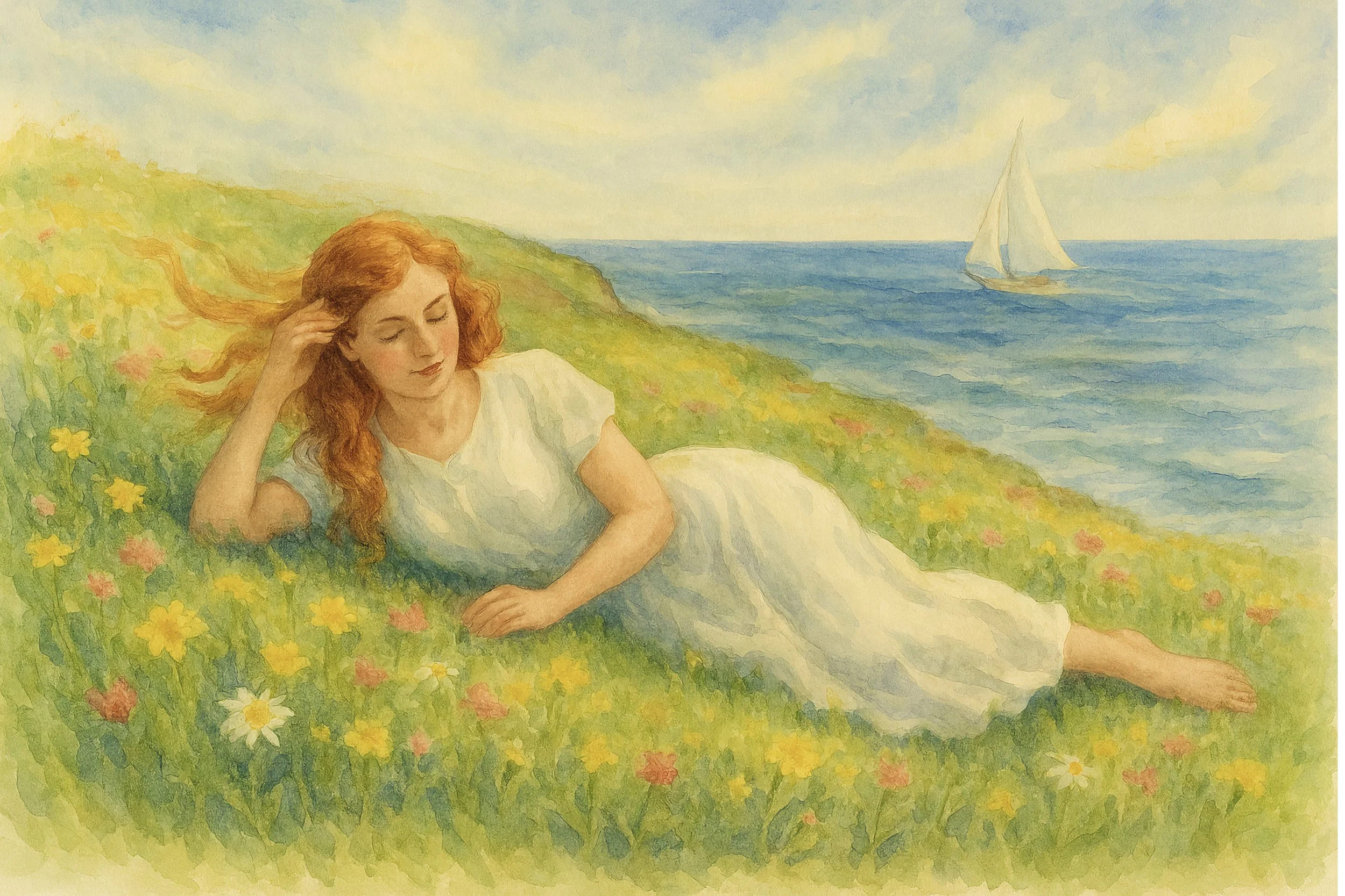On a hillside kissed by morning light, where wildflowers sway like soft-spoken secrets and the sea glimmers with quiet promise, a woman rests—her red hair a flame against the cool hush of cotton and breeze. Dreamy Rest by the Sea is not merely a painting; it is a love letter to stillness, to the kind of freedom that drifts just beyond the horizon like a lone sailboat in bloom.